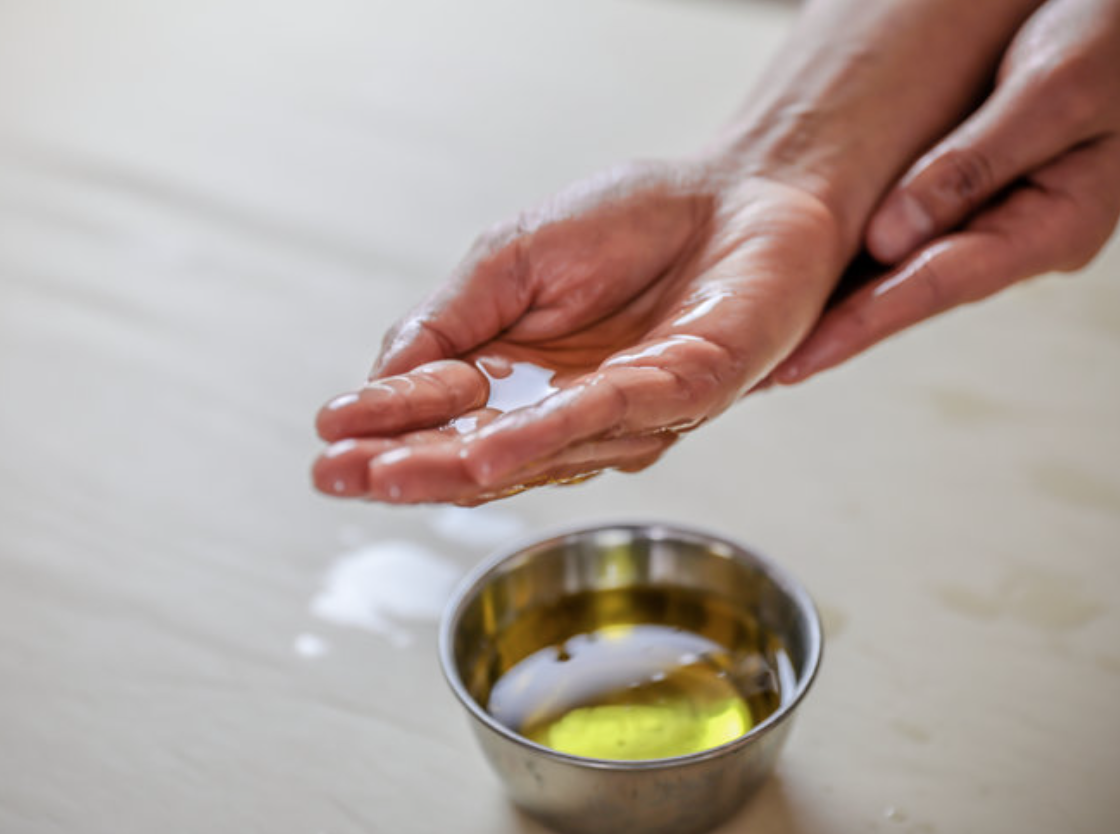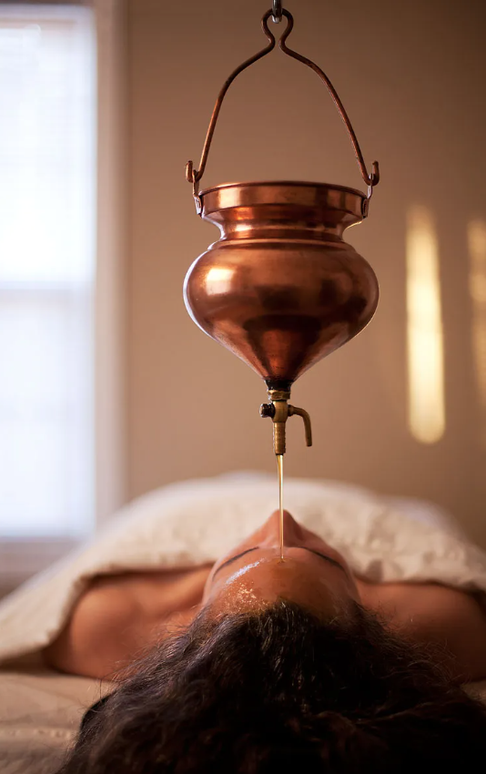 This is a warm oil treatment on the forehead with a consistent stream of oil that flows from the third eye to the crow of the head. This helps with sleep disorders, headaches, stress, anxiety